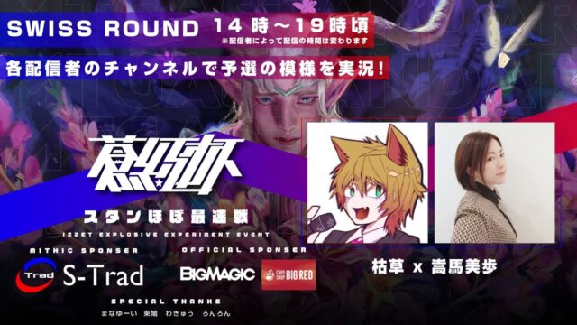 枯草ちゃんねる 枯草です。今回は声優の嵩馬美歩さん()と共に蒼紅杯のスイスラウンドを実況させて頂きます。 大会詳細はこちらから 本配信は蒼紅杯運営から許可を得てSwissラウンドの対戦の実況を行います。 スタンダードBO3、Swiss6回戦...