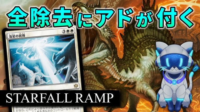 MTGアリーナのスタンダードのデッキ紹介です。《荒々しい三つ子》《宝物庫生まれの暴君》《跳ねる春、ベーザ》などのクリーチャーを出した状態で《落星の祈祷》を撃つと膨大なアドバンテージを得られます。ランプデッキの新入り《山積みの収穫》も良いカー...